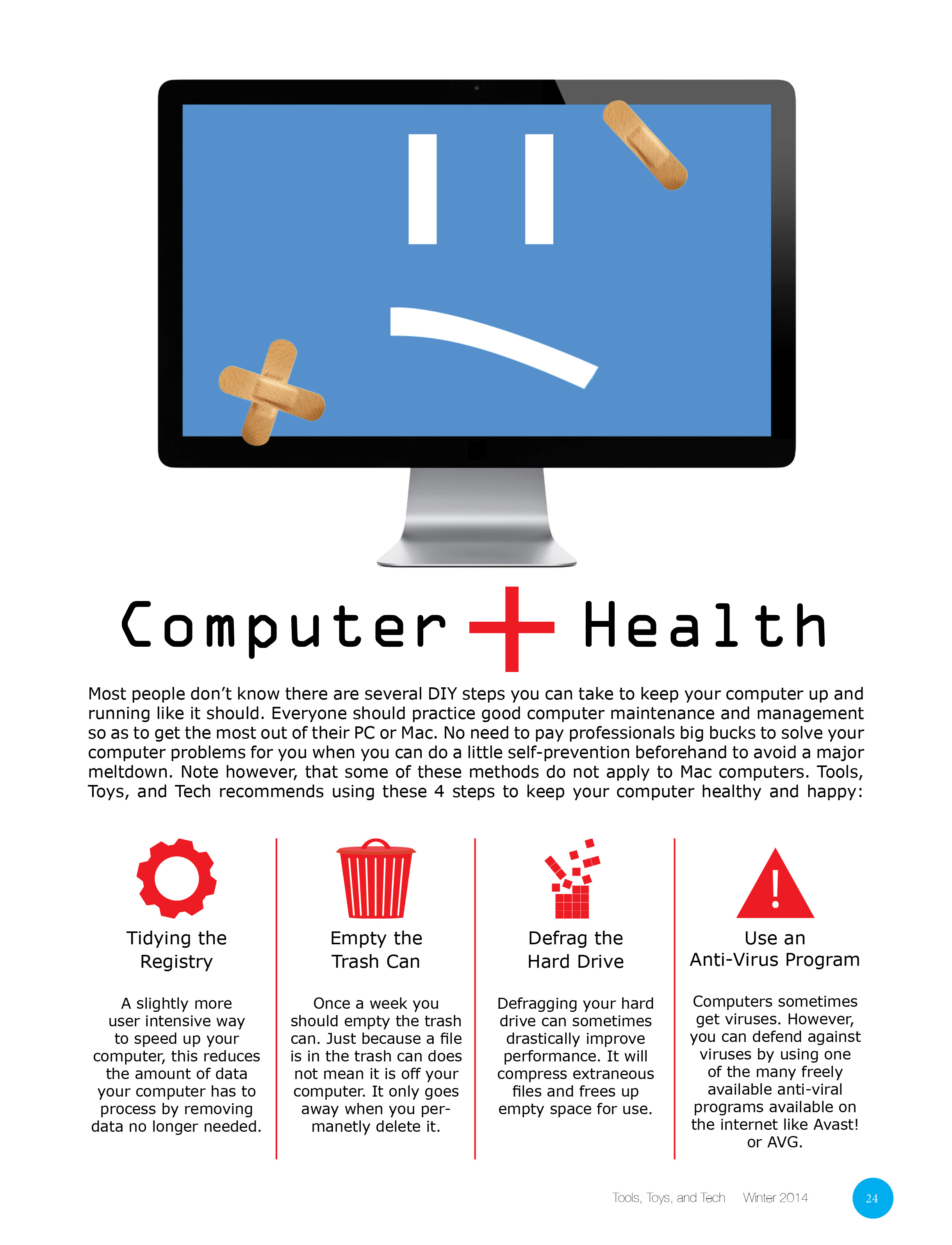 A one-page magazine article that explains some basic steps you can take to keep your computer healthy and running optimally. Decided to make it mimic the infographic style of layout.